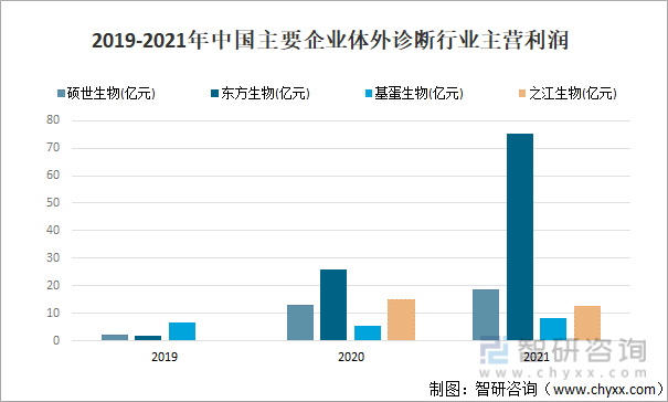 从主营利润数据来看,2021年硕世生物体外诊断行业主营利润为18.54亿元;东方生物体外诊断行业主营利润为75.24亿元;基蛋生物体外诊断行业主营利润为8.37亿元;之江生物体外诊断行业主营利润12.46亿元。