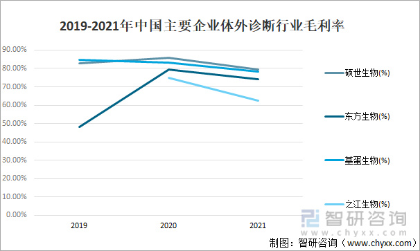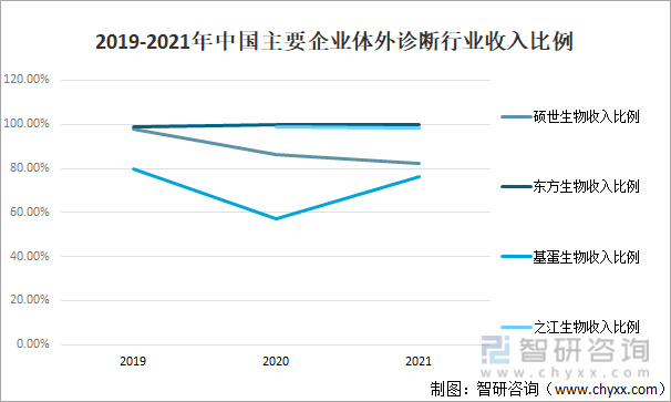 其中2021年硕世生物体外诊断行业收入比例82.42%;东方生物体外诊断行业收入比例99.83%;基蛋生物体外诊断行业收入比例76.36%;之江生物体外诊断行业收入比例98.74%。