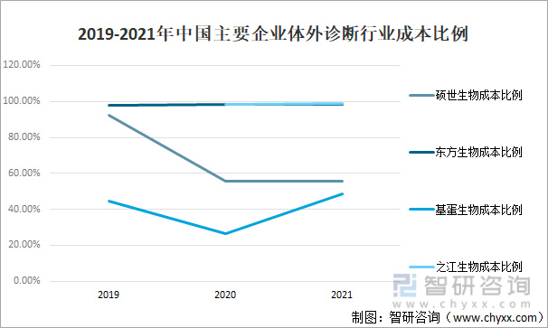 2021年硕世生物体外诊断行业成本比例为55.43%;东方生物体外诊断行业成本比例为98.6%;基蛋生物体外诊断行业成本比例为48.36%;之江生物体外诊断行业成本比例为98.71%。