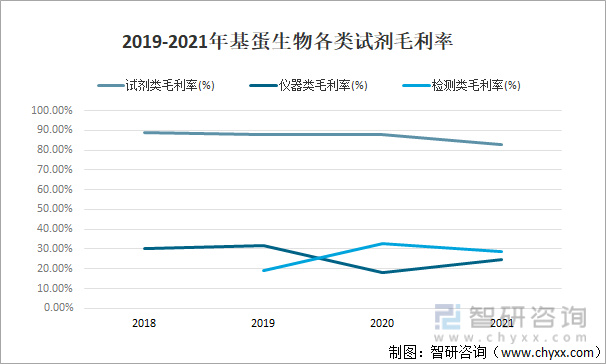 从基蛋生物各类试剂毛利率来看,2020-2021年仪器类毛利率呈上涨走势,其中2021年基蛋生物试剂类毛利率82.87%;基蛋生物仪器类毛利率24.87%;基蛋生物检测类毛利率28.79%。