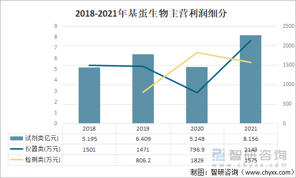 据公司年报数据,2021年基蛋生物试剂类主营利润8.156亿元;基蛋生物仪器类主营利润2143万元;基蛋生物检测类主营利润1575万元。