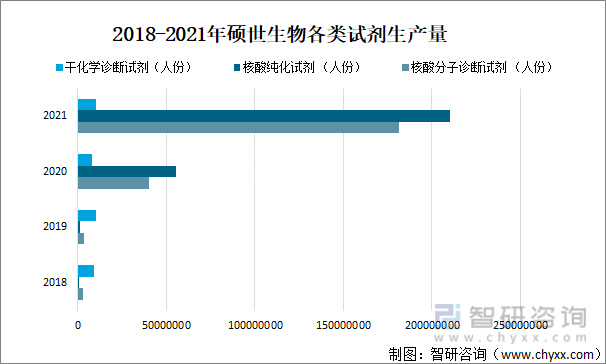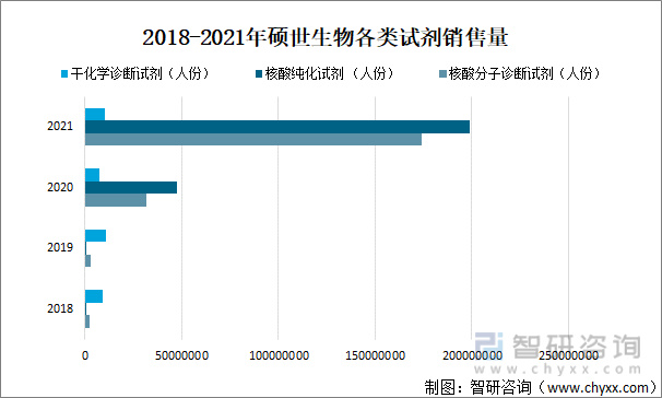 2021年核酸纯化试剂销售突增,其中2021年硕世生物核酸分子诊断试剂销售量174230668人份;核酸纯化试剂销售量198897405人份;干化学诊断试剂销售量10208870人份。