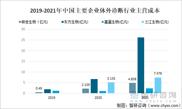 2021年硕世生物体外诊断行业主营成本4.858亿元;东方生物体外诊断行业主营成本26.28亿元;基蛋生物体外诊断行业主营成本2.33亿元;之江生物体外诊断行业主营成本7.48亿元。